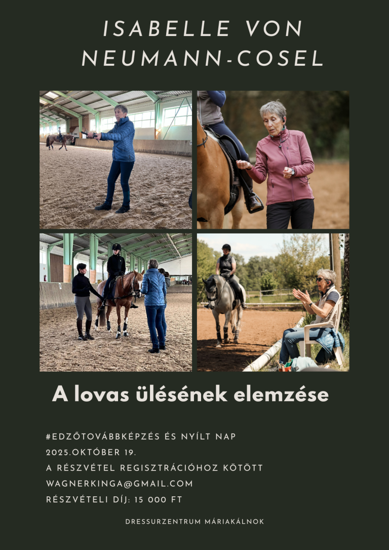 2025.10.18-19-én ismét „Train the trainers” programnak ad otthont a Dressurzentrum Máriakálnok. A képzés vezetője Isabelle von Neumann-Cosel német bíró, edző és szakíró, több ismert szakkönyv (Das Pferdebuch für Junge Reiter, Balance In Bewegung, Így kíméld a hátad lovas, A láthatatlan segítségek titka) szerzője. Ezúttal a lovas ülésének az elemzése lesz a téma kezdőtől haladó szintig….