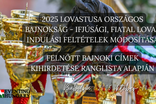 Tisztelt Lovasok, Lovastusa OB-ra készülők! A Lovatusa Szakbizottság döntése értelmében a 2025. évi Ifjúsági és Fiatal Lovas Országos Bajnokságokon az adott korosztály versenyzői – a sportág szakmai színvonalának megőrzése mellett – akkor is indulhatnak, ha hivatalos minősítő eredményt nem szereztek arra, feltéve, hogy legalább egy, a korosztályuknak megfelelő szintű versenyt teljesítettek és szabályszerűen befejeztek. Mivel…