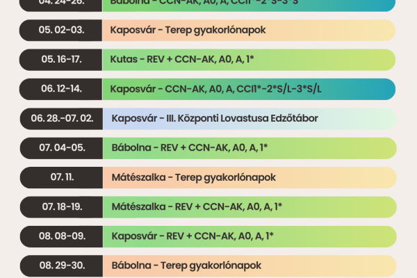 Kedves Lovasok! Összeállt a jövő évi szabadtéri szezon versenynaptárának tervezete. Reméljük, sok jó hangulatú versenyen és gyakorlónapon találkozunk az újévben is! Addig is, várunk szeretettel Benneteket a balatonvilágosi és kaposvári fedettpályás versenyeken!